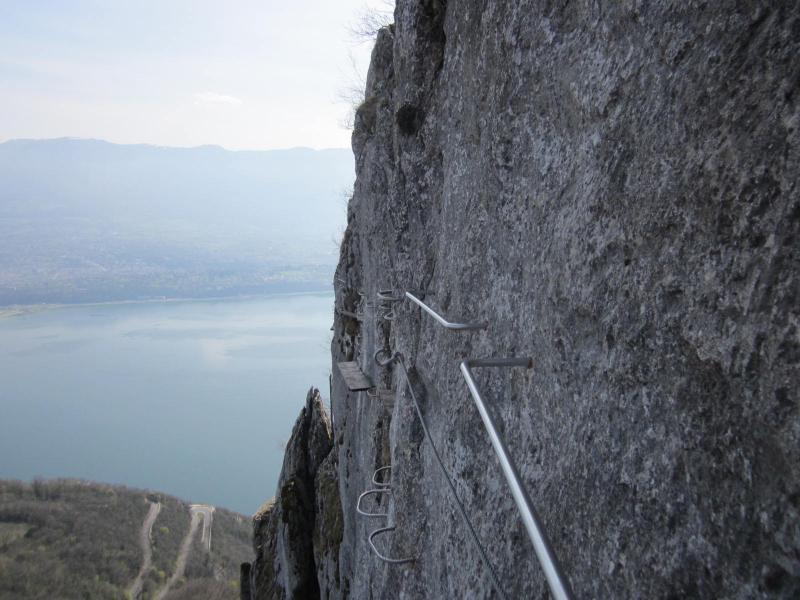 Via Ferrata La Dent du Chat du dessus du Lac du Bourget Août 12Via Ferrata Activité intermédiaire entre la randonnée pédestre et l'escalade, la Via Ferrata est un itinéraire aménagé sur une paroi rocheuse, à l'aide d'équipements spécifiques (câbles, échelles, rampes, etc) destinés à faciliter la progression en sécuritéPassage sur passerelles Vue aérienne dans la via du Cornillon Via ferrata à aix les bains, roc de Cornillon, Massif de la Chartreuse Apparition du lac du Bourget Les passerelles dans la via du Roc de Cornillon